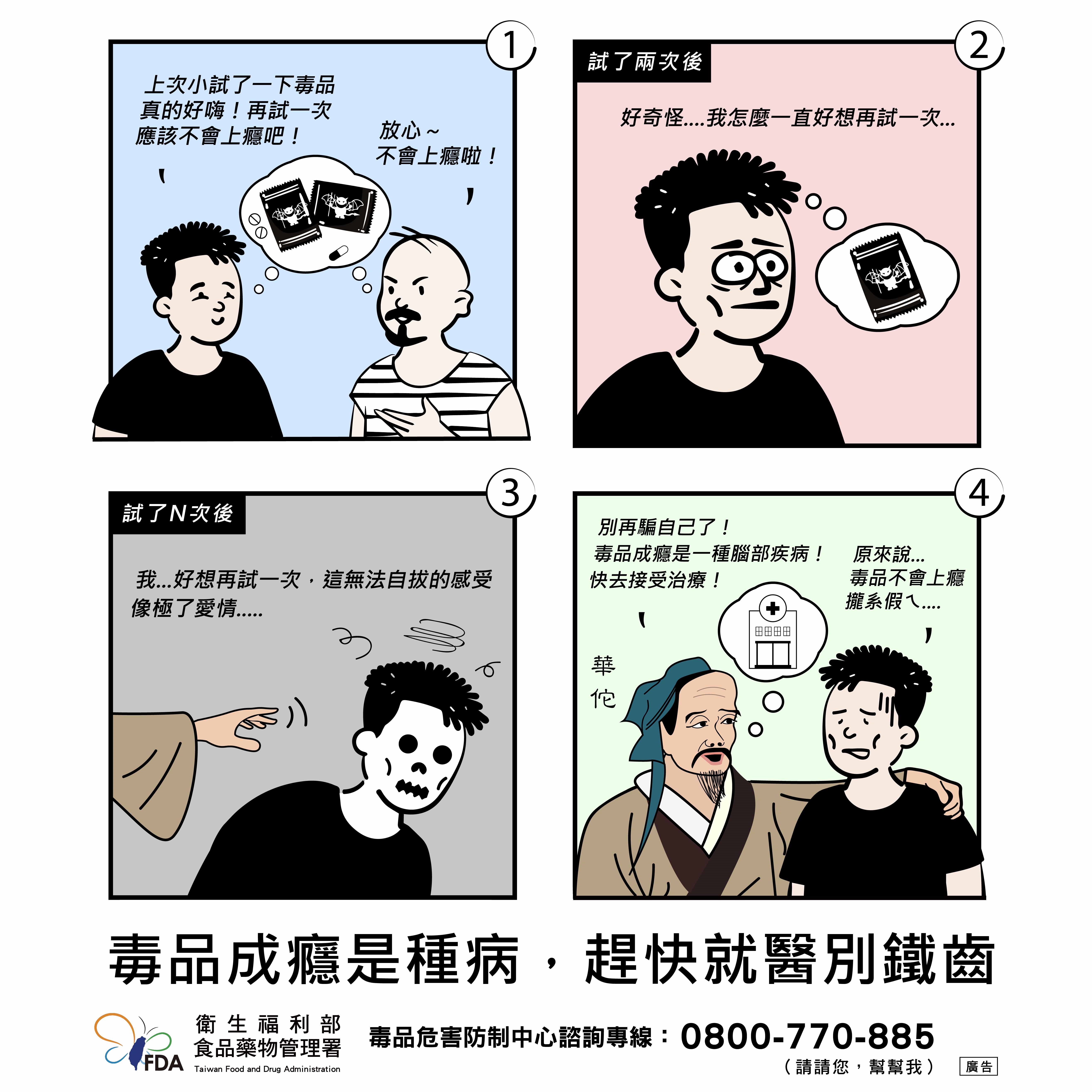 反毒四格漫畫_毒品成癮是種病 趕快就醫別鐵齒(出處衛福部食藥署)